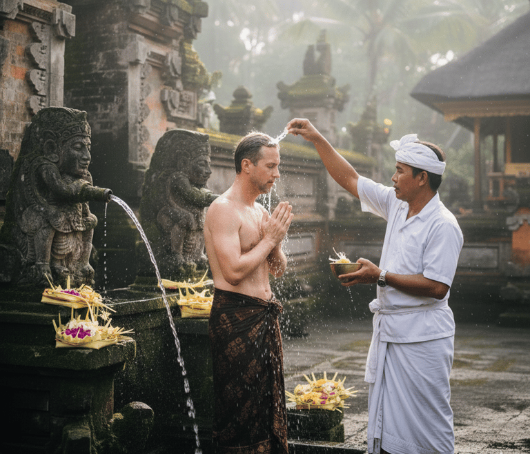 • Sacred water purification (melukat) guided respectfully